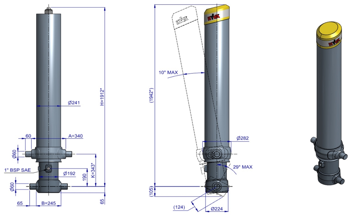 Цей циліндр призначений лише для підйому. Його не слід використовувати як конструкційний елемент і не слід піддавати бічним навантаженням. Клапан опрокидування повинен мати скидання тиску на отворі циліндра, встановлене не вище максимального робочого тиску. Переконайтеся в максимальному навантаженні на циліндр. Робочий діапазон температур складає від -40°C до +80°C. Максимальна тривалість висування становить 0,5 години (за винятком закалених сходинок з твердим хромуванням). Циліндр фарбований чорним кольором (RAL9005) з мінімальною товщиною покриття, відповідною 480-годинному випробуванню в нейтральному сольовому тумані згідно з ISO 9227. ¹ Обмежувач ходу циліндра Hyva. ² Незначне розгрузження. ³ Значне розгрузження