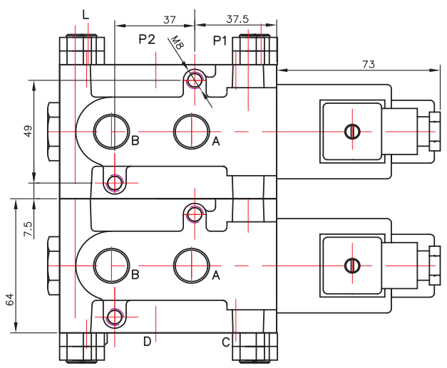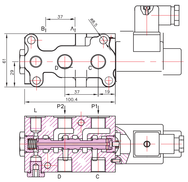 Клапан має електромагнітне управління. Корпус виготовлений з чавуну EN-GJL-300. Золотники виготовлені з науглероженої сталі та загартовані. Кріпиться двома болтами M8.