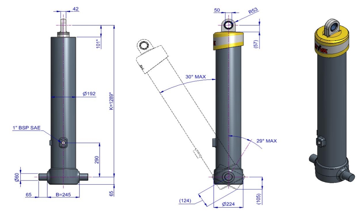 - Максимальне навантаження на циліндр (початок перекидання): 245 кН