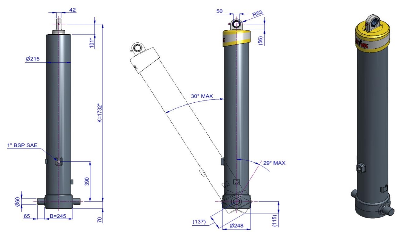 Цей циліндр є лише підйомним пристроєм. Його не слід використовувати як елемент конструкції і не слід піддавати бічним навантаженням. Перекидальний клапан повинен мати скидання тиску на отворі циліндра, встановлене не вище макс. робочого тиску Переконайтеся у максимальному навантаженні на циліндр. Робочий діапазон температур становить від -40°C до +80°C. Максимальна тривалість висування становить 0,5 години (за винятком загартованих ступенів із твердим хромуванням).Циліндр пофарбований у чорний колір (RAL9005) з мінімальною товщиною покриття, що відповідає 480-годинному випробуванню в нейтральному сольовому тумані згідно з ISO 9227. ¹ Обмежувач ходу циліндра Hyva.