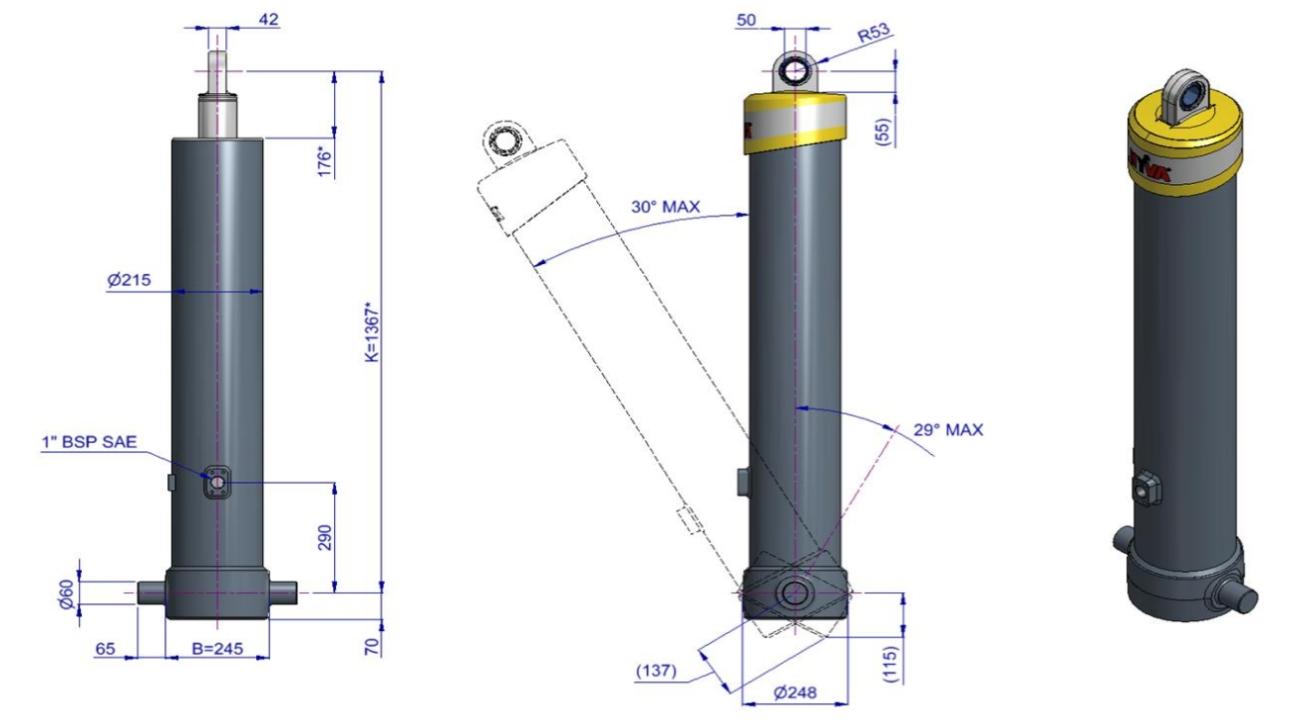 Фронтальний циліндр Hyva FE A191-6-06040-019-K1367-HC з вушком (FE) має 6 штоків і здатний підіймати до 57 тонн, досягаючи загального ходу 6040 мм при тиску 220 бар. Ефективний діаметр складає 191 мм, а вага циліндра становить 257 кг