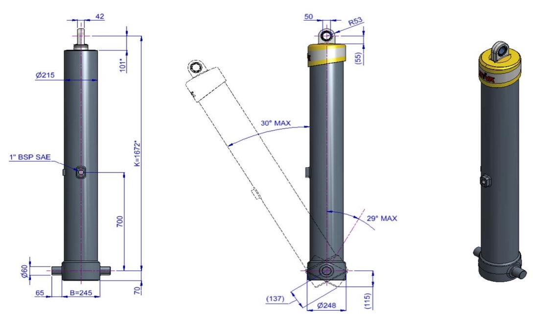 | Максимальне навантаження циліндра (початок перекидання) | 245 кН |