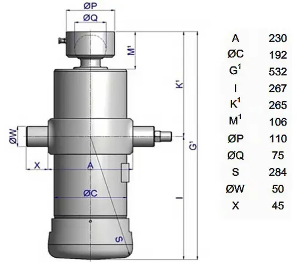 Опис / Гідроциліндр підкузовний HYVA UMB 169-5-1480-K265-50-3/4-HC, підйом до 29 тонн