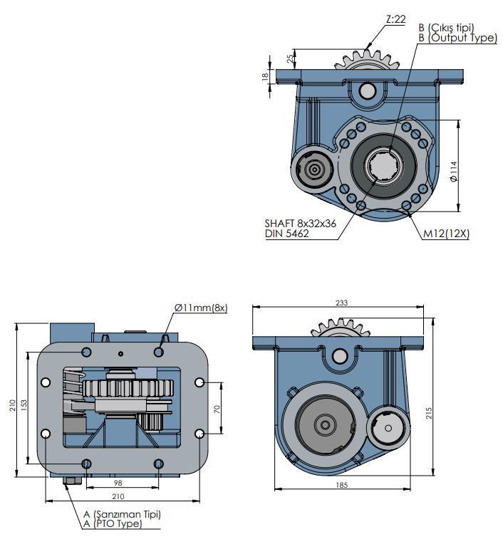 Стандарт приєднання: Вал B8x32x36 (8 шліців, Ø36 мм), монтажний фланець ISO (4 отвори, 80x80 мм).