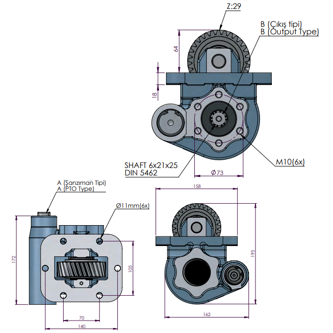 Стандарт приєднання: Вал B6x21x25 (6 шліців, Ø25 мм), монтажний фланець UNI (3 отвори).