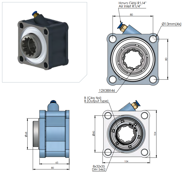 Стандарт приєднання: Вал B8x32x36 (8 шліців, Ø36 мм), монтажний фланець ISO (4 отвори, 80x80 мм).