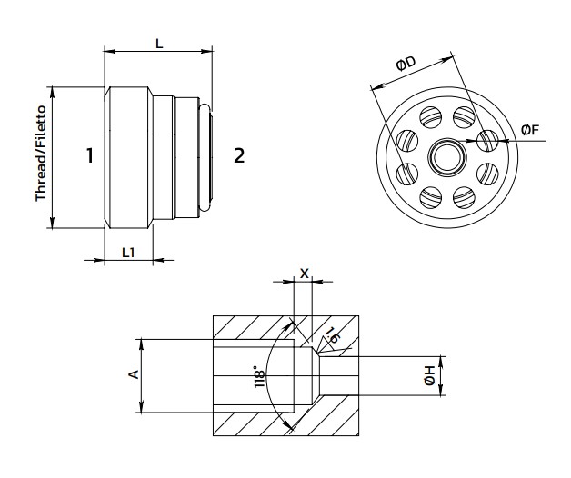 | Код | різьблення | L | L1 | ØF | ØD | A | X | ØH | Вага кг | Макс. потік | Тиск відкриття | Макс. тиск | Момент затягування |