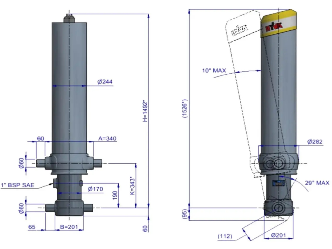 Этот цилиндр является только подъемным устройством. Его не следует использовать в качестве элемента конструкции и не следует подвергать боковым нагрузкам. Опрокидывающий клапан должен иметь сброс давления на отверстии цилиндра, установленный не выше макс. рабочего давления. Убедитесь в максимальной нагрузке на цилиндр. Рабочий диапазон температур составляет от -40°C до +80°C. Максимальная продолжительность выдвижения составляет 0,5 часа (за исключением закаленных ступеней с твердым хромированием). Цилиндр окрашен в черный цвет (RAL9005) с минимальной толщиной покрытия, соответствующей 480-часовому испытанию в нейтральном солевом тумане согласно ISO 9227. ¹ Клапан сброса Hyva.