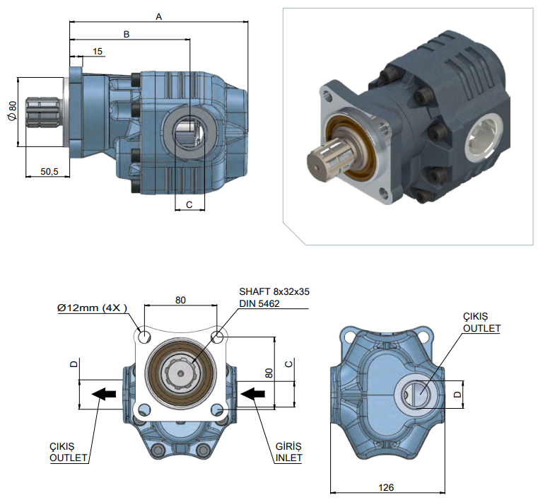 Присоединительный стандарт: Вал B8x32x36 (8 шлицов, Ø36 мм), Монтажный фланец ISO (4 отверстия, 80x80).