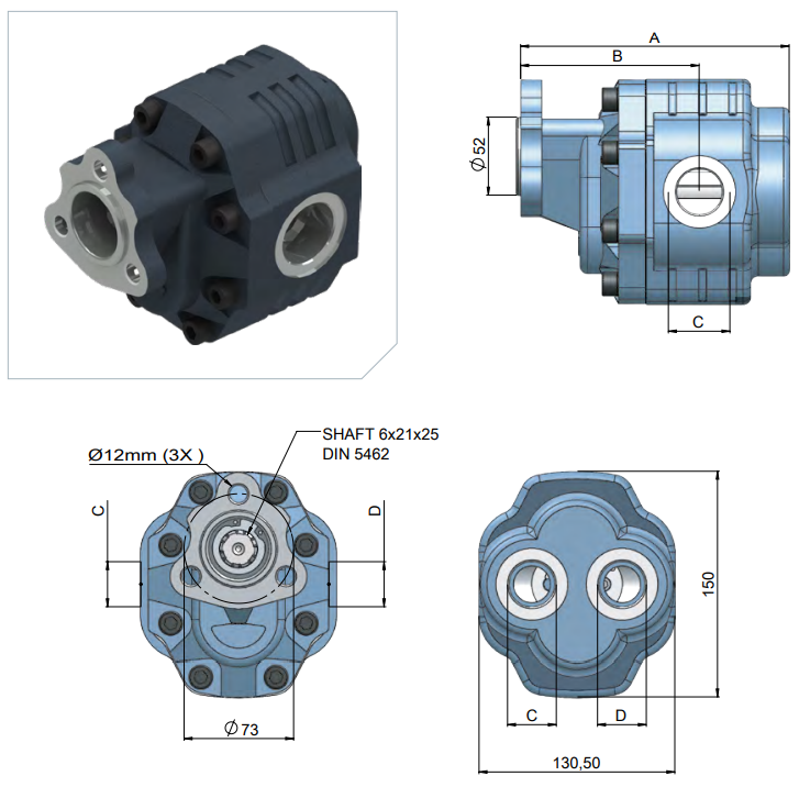 Присоединительный стандарт: Вал B6x21x25 (6 шлицов, Ø25 мм), Монтажный фланец UNI (3 отверстия).
