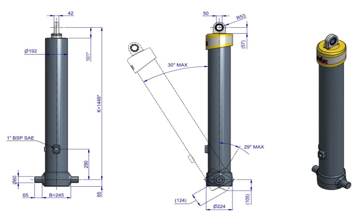 Фронтальный цилиндр Hyva FE A169-5-05830-011-K1449-HC с одной проушиной (FE) обладает 5 хромированными штоками и способен поднимать до 56 тонн, достигая общего хода 5830 мм при давлении 250 бар. Эффективный диаметр составляет 169 мм, а вес цилиндра составляет 225 кг.