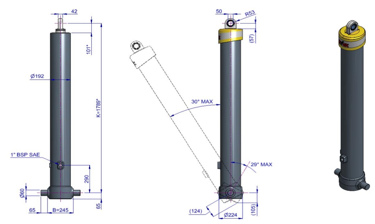 Этот цилиндр является только подъемным устройством. Его не следует использовать в качестве элемента конструкции и не следует подвергать боковым нагрузкам. Опрокидывающий клапан должен иметь сброс давления на отверстии цилиндра, установленный не выше макс. рабочего давления. Убедитесь в максимальной нагрузке на цилиндр. Рабочий диапазон температур составляет от -40°C до +80°C. Максимальная продолжительность выдвижения составляет 0,5 часа (за исключением закаленных ступеней с твердым хромированием). Цилиндр окрашен в черный цвет (RAL9005) с минимальной толщиной покрытия, соответствующей 480-часовому испытанию в нейтральном солевом тумане согласно ISO 9227. ¹Ограничитель хода цилиндра Hyva.