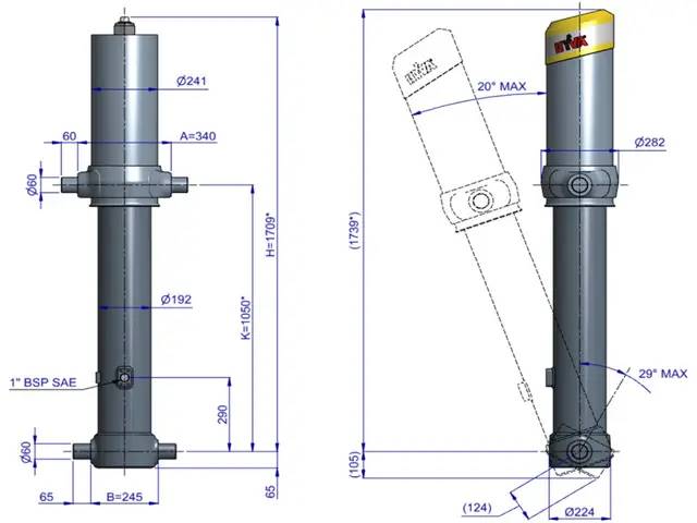 Этот цилиндр является только подъемным устройством. Его не следует использовать в качестве элемента конструкции и не следует подвергать боковым нагрузкам. Опрокидывающий клапан должен иметь сброс давления на отверстии цилиндра, установленный не выше макс. рабочего давления. Убедитесь в максимальной нагрузке на цилиндр. Рабочий диапазон температур составляет от -40°C до +80°C. Максимальная продолжительность выдвижения составляет 0,5 часа (за исключением закаленных ступеней с твердым хромированием). Цилиндр окрашен в черный цвет (RAL9005) с минимальной толщиной покрытия, соответствующей 480-часовому испытанию в нейтральном солевом тумане согласно ISO 9227. ¹ Ограничитель хода цилиндра Hyva.