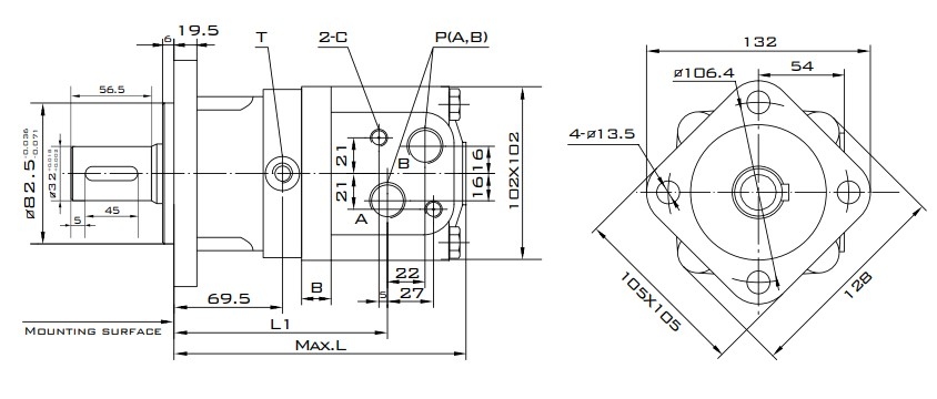 - Тип фланца: квадратный фланец A, 105×105 мм с четырмя отверстиями