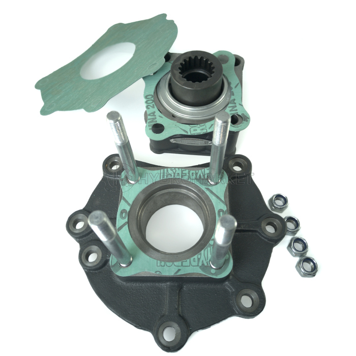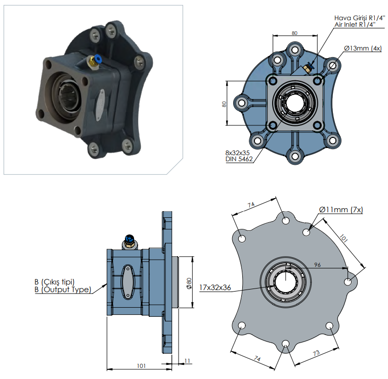 Стандарт присоединения: Вал B8x32x36 (8 шлицов, Ø36 мм), монтажный фланец ISO (4 отверстия, 80x80 мм).