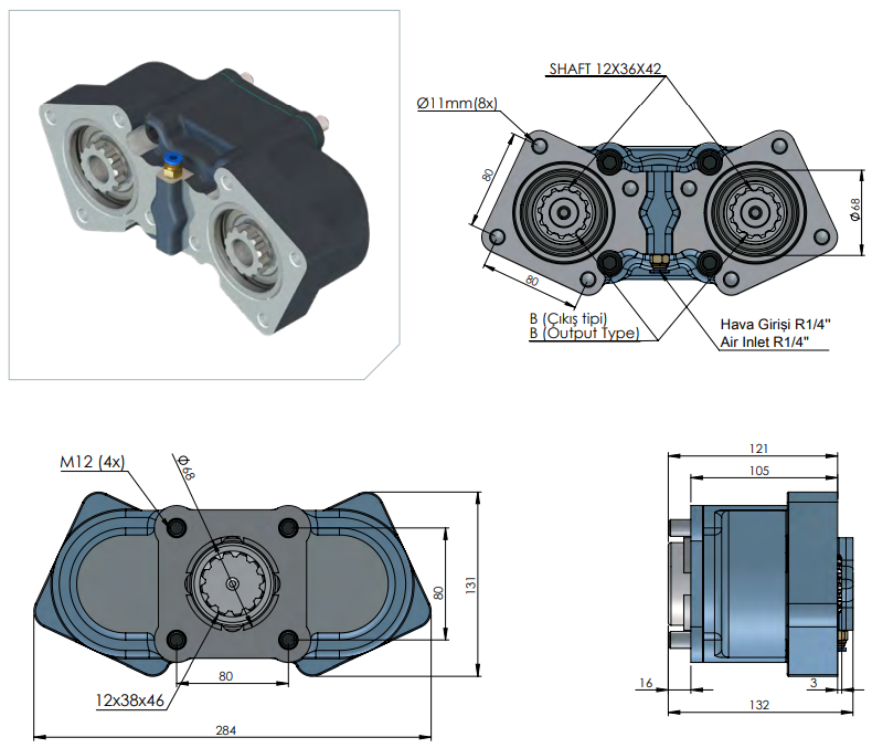 Присоединительный стандарт со стороны насоса: Вал 8x32x36 (8 шлицов, Ø36 мм), Фланец ISO (4 отверстия).