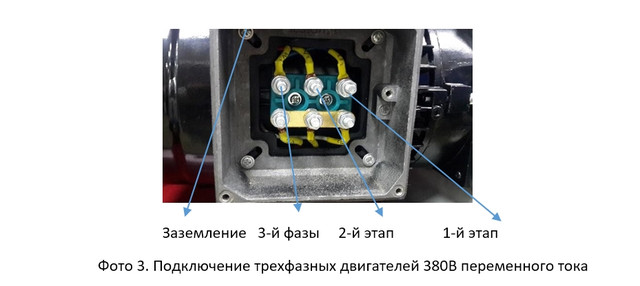 Крышка соединительной коробки клеммы двигателя снята. Гайки клемм
